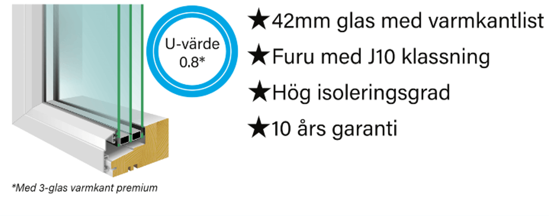 3-glas med varmkantlist ger ett u-värde på 0,9 på hela konstruktionen.